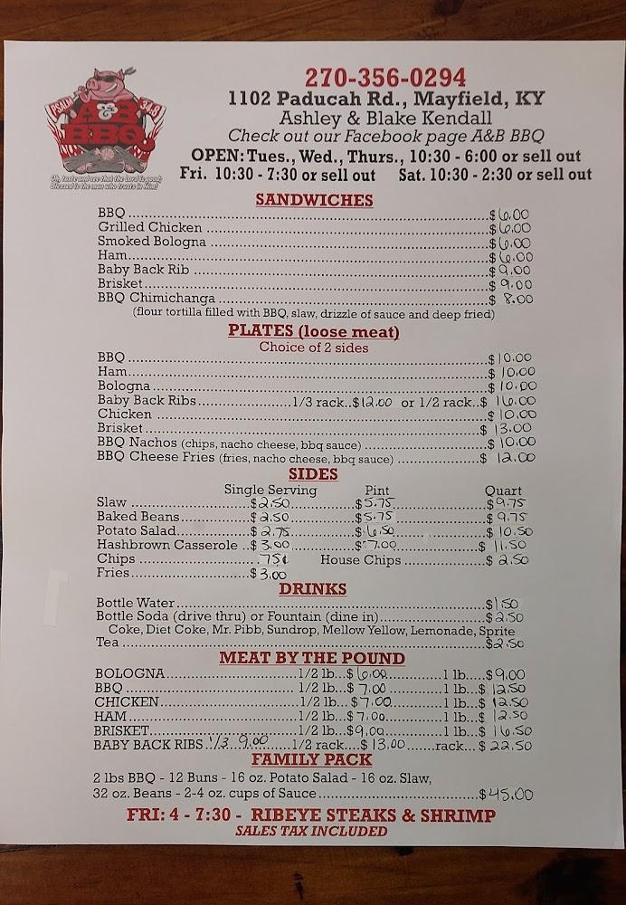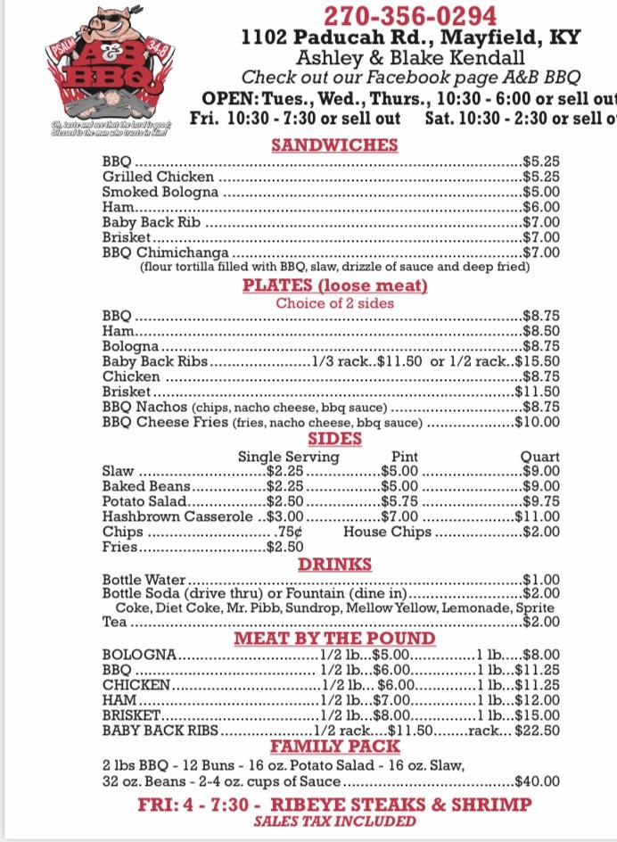 Welcome to A&B BBQ, your go-to destination for mouthwatering grilled specialties in Mayfield, KY. Conveniently located at 1102 Paducah Rd, we offer a relaxed atmosphere perfect for breakfast, lunch, and dinner. Enjoy our delicious smoked meats like pulled pork and crispy fries, with options for takeout, delivery, and dine-in. Our welcoming space is accessible to all, featuring wheelchair-friendly seating and restrooms. Ideal for solo diners and groups alike, A&B BBQ is popular for its cozy ambiance and scrumptious local flavors. Don't forget to explore our kid-friendly menu! Join us today for an unforgettable BBQ experience.